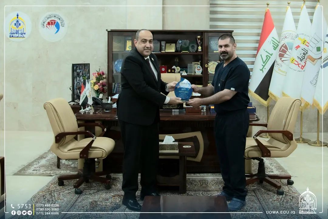 Pictures... At the end of the "intensive training course" for students of the College of Medicine, the University President honors the trained doctors with a shield of thanks and appreciation, for their valuable efforts in making this important course a success, which won the approval of the students.