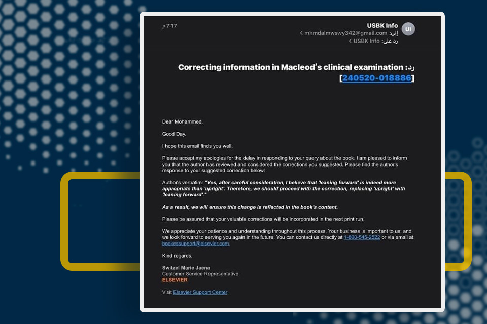 After thorough investigation and confirmation from several sources—including Bailey and Loves, an approved source on surgery—the error was confirmed. The issue was identified and will be fixed in the upcoming version of the book, emphasising the contribution of academic research and student involvement in expanding the accuracy and scope of medical knowledge, following correspondence with the printing house and the author.